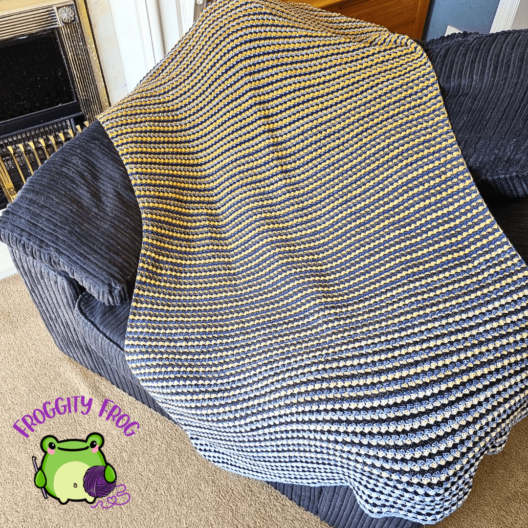 This gauge gave me a finished blanket measuring 140 x 80cm – the perfect size for a lap blanket.