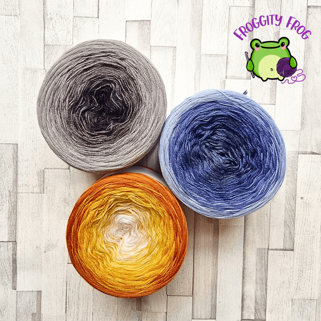 I used 3 yarn cakes from Yarn Shop By Stay Alive. All 3 are 4 ply 100% merino ombre cakes with 1000m of yarn in each. The cakes I chose are: