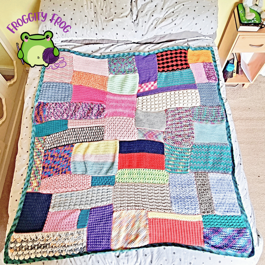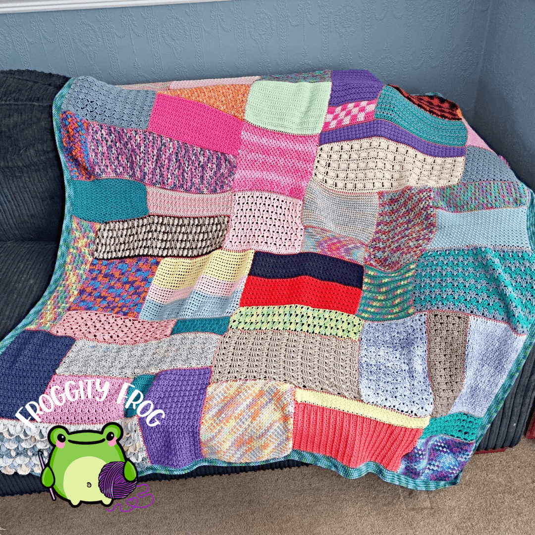 The FrankenScrap Sampler Blanket was originally released as a crochet along in 2024 and is still available for free on my blog here.